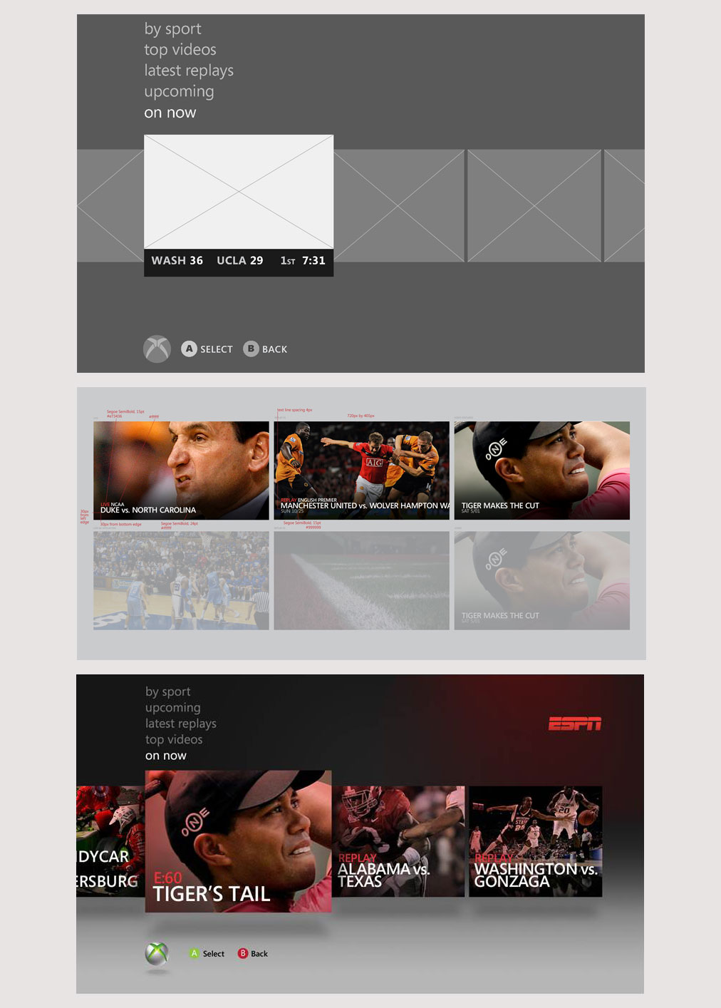 My role was in designing menus for applications such as ESPN, Hulu, Netflix, Xbox Video Chat, Kumo Chat, Zune and many others. These menus could seamlessly slide from side to side, and individual cells could parallax to create an astounding 3D effect. This required the use of flow-charts and motion studies to implement the menus using vector elements and timeline animations.
